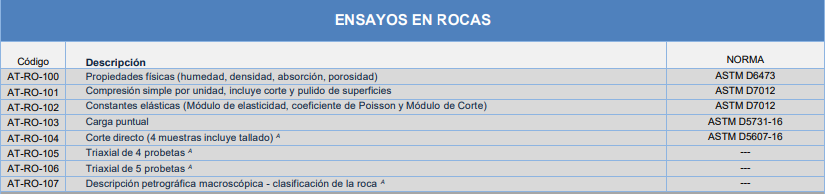 Realizamos servicios de ensayos en rocas con fines de determinar sus propiedades físicas y propiedades mecánicas las cuales permitirán analizar las propiedades mecánicas de las formaciones rocosas subyacentes en proyectos de construcción y obras de ingeniería. Dichas propiedades son esenciales para la seguridad y la estabilidad de las estructuras a construir sobre o dentro de las rocas.